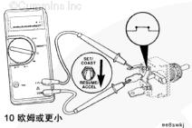 萬用表的一支表筆接觸開關(guān)的 RESUME/ACCEL(恢復/加速)端子。另一支表筆接觸底盤接地將該開關(guān)撥到 SET/COAST(設(shè)置/滑行)位置,然后再到 RESUME/ACCEL(恢復/加速)位置。測量電阻。