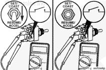 萬用表的一支表筆接觸開關(guān)的 SET/COAST(設(shè)置/滑行)端子。用萬用表的另一支表筆接觸底盤接地端。將該開關(guān)撥到 RESUME/ACCEL(恢復/加速)位置,然后再到 SET/COAST(設(shè)置/滑行)位置。測量電阻。