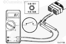 調(diào)整萬用表以便測量電阻。將測試導線插入 OEM 線束接頭的巡航控制 ON/OFF 開關(guān)輸入觸針,然后將其連接到萬用表表筆上。從鱷魚夾上拆下另一根萬用表表筆,然后將其接觸康明斯ISF3.8 CM2220發(fā)動機缸體接地。