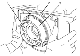 4.對齊塑料套管(3)與Perkins1106A/C發(fā)動機曲軸法蘭(1)。確保塑料套管在Perkins1106A/C發(fā)動機曲軸法蘭上嚙合。將新Perkins1106A/C發(fā)動機曲軸后油封(2)的四角推到Perkins1106A/C發(fā)動機曲軸法蘭上。在這個操作過程中,會把塑料套管壓出Perkins1106A/C發(fā)動機曲軸后油封。棄置塑料套管。