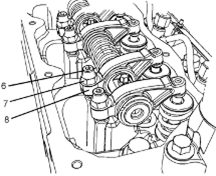 6松開所有搖臂(8)上的螺母(7)。擰松所有搖臂(8)上的調(diào)節(jié)器(6),直到所有氣門完全閉合。
