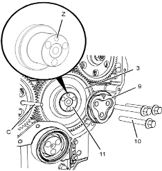 7對準(zhǔn)Perkins1106A/C發(fā)動機(jī)惰齒輪(3)與Perkins1106A/C發(fā)動機(jī)凸輪軸齒輪上的的正時標(biāo)記。請參閱插圖135。將Perkins1106A/C發(fā)動機(jī)惰齒輪組件(3)和輪轂(11)安裝到正時箱的凹槽中。確保油孔(Z)靠近輪轂頂部。