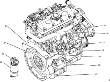 (21)機(jī)油排放塞(22)燃油粗濾器(23)充油泵(24)飛輪(25)飛輪殼體