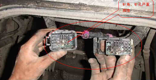 檢查水溫傳感器接插件,清除故障碼后冷卻水溫信號超高限故障不再出現(xiàn),但是用檢測儀檢測到故障碼:“256指示燈1驅(qū)動線路故障”頻繁出現(xiàn),玉柴電噴柴油發(fā)動機(jī)還是經(jīng)常自動熄火,檢查玉柴電噴柴油發(fā)動機(jī)線束,發(fā)現(xiàn)線束42接插件進(jìn)水,針腳已嚴(yán)重腐蝕,見圖5,